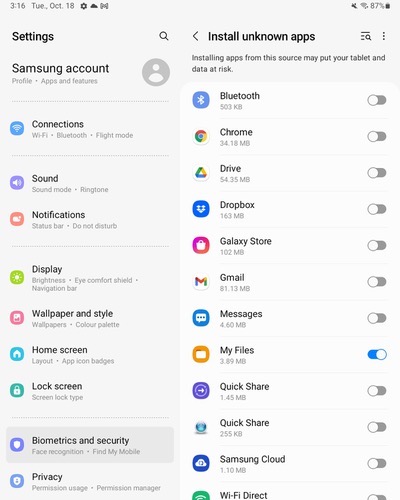 Settings -> Biometrics_and_Security -> Install_unknown_apps - Enable Setting for